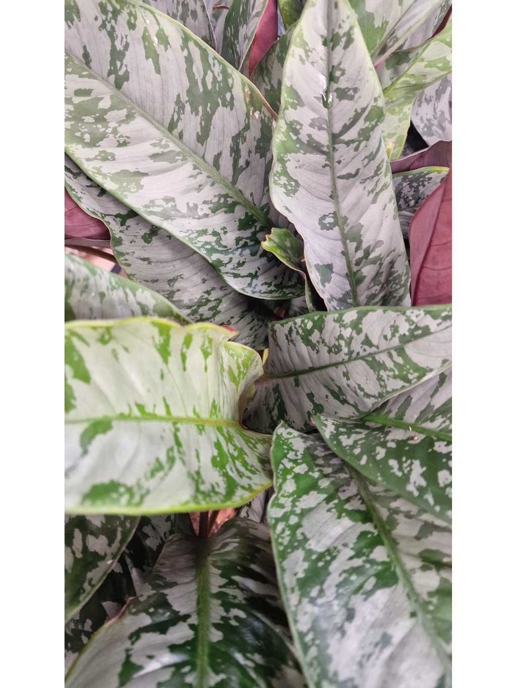 Rostlina vyniká protáhlými kopinatými listy s výrazným tmavě zeleným až fialovým mramorováním, které působí sametově a elegantně. Spodní strana listů často získává purpurový až vínový odstín. Listy vyrůstají z pevného, krátkého stonku a vytvářejí kompaktní trs, který může dosahovat výšky kolem 40–60 cm.