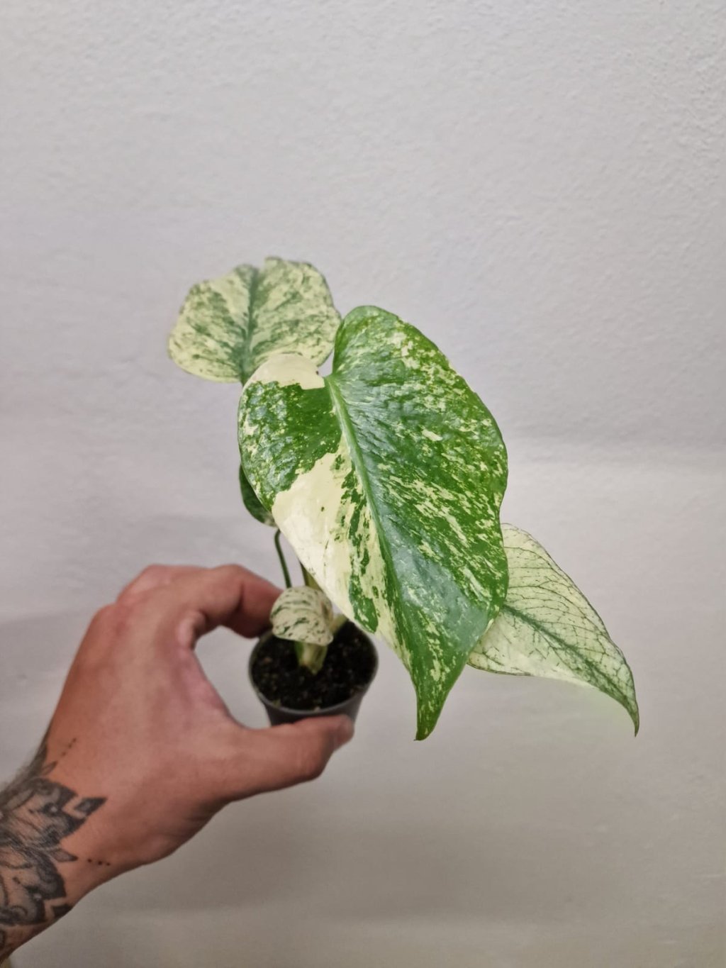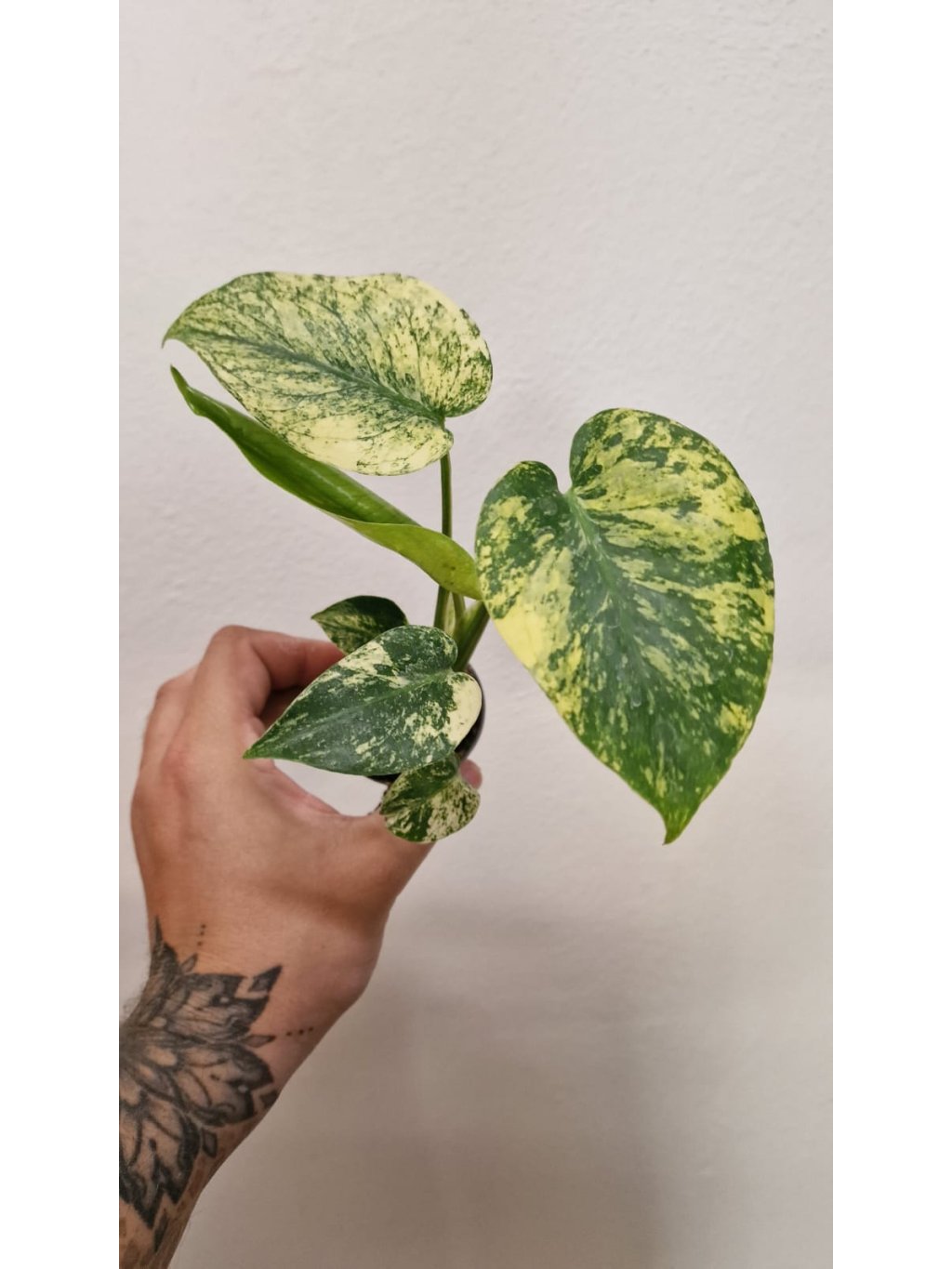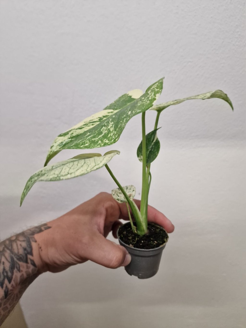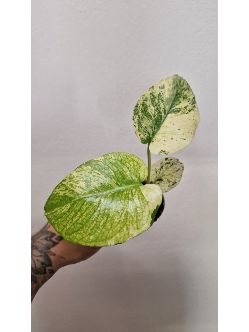 Listy jsou velké, s typickými hlubokými výřezy a otvory, které jsou pro druh Monstera deliciosa charakteristické. Panašování každého listu je jedinečné – může být jemné i intenzivní, od lehkého šrafování až po celé světlejší části. Rostlina dorůstá výšky i přes 1 metr a často potřebuje oporu, například mechový kůl, ke kterému se přichytává vzdušnými kořeny.