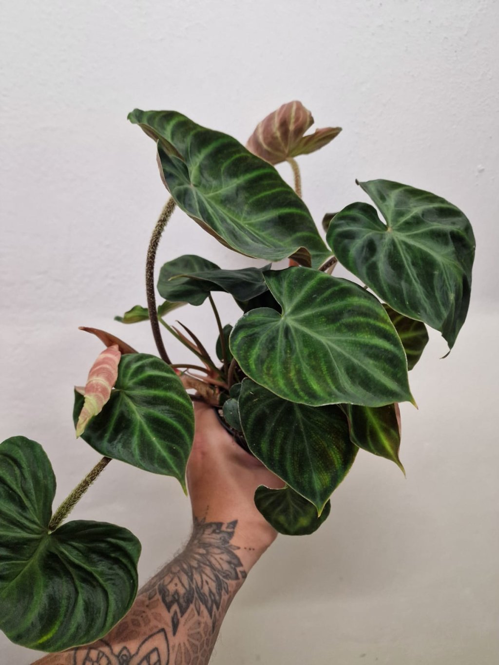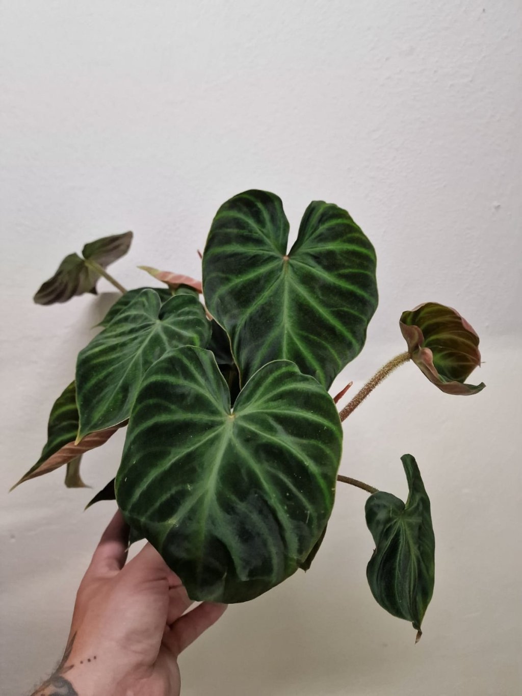 Philodendron incensi verucosum je jedinečná a vizuálně poutavá rostlina pocházející z tropických oblastí Jižní Ameriky. Tento druh je známý svými výrazně sametovými, srdčitými listy, které mají hlubokou, tmavě zelenou barvu a kontrastní světlou žilnatinu. Povrch listů působí luxusně sametově a mění odlesky v závislosti na úhlu světla. Řapíky bývají mírně chlupaté a stonky mohou mít specifické bradavičnaté (verukózní) výrůstky, které jsou pro tuto varietu charakteristické.