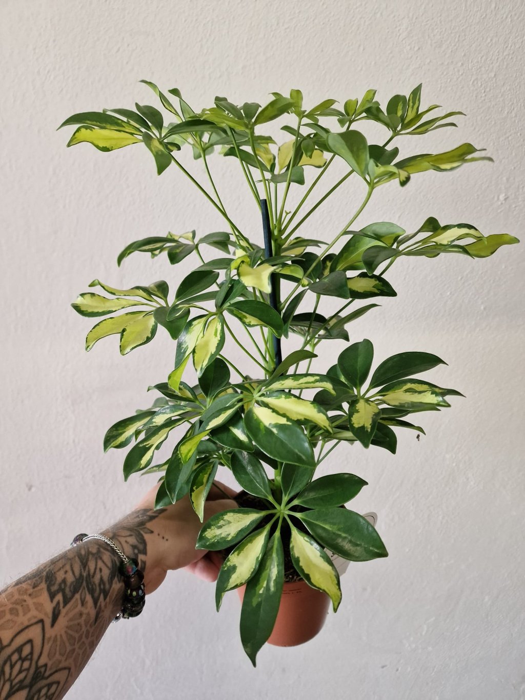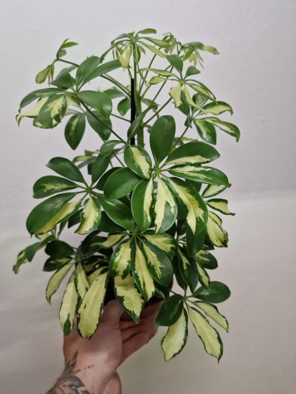 Listy Schefflery 'Gerda Variegata' jsou tmavě zelené s bílými až krémovými skvrnami, což vytváří elegantní, kontrastní vzhled. Tato variegovaná odrůda je oblíbená pro svůj atraktivní vzhled a schopnost oživit každý prostor. Růst je kompaktní, což znamená, že se hodí i do menších místností nebo na stoly, regály či jako solitéra.